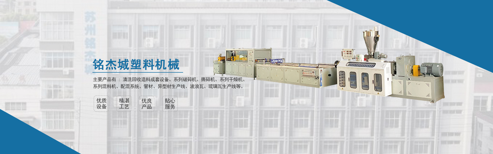 蘇州銘杰城塑料機械有限公司座落于江蘇長(cháng)江之濱,東部沿海國家文明衛生城市 - 張家港市。 地理位置優(yōu)越,東臨上海,西接南京,南壤蘇錫常地區,水陸交通極為便捷。 銘杰城塑料機械是一家集生產(chǎn)研制、技術(shù)服務(wù)、新品開(kāi)發(fā)于一體的塑機制造專(zhuān)業(yè)廠(chǎng)商,擁有完善 的開(kāi)發(fā)設計系統和經(jīng)驗豐富的技術(shù)隊伍,主要產(chǎn)品有 : 清洗回收造料成套設備、系列破碎機、撕 碎機、系列干燥機、系列混料機、配混系統、管材、異型材生產(chǎn)線(xiàn)、波浪瓦、琉璃瓦生產(chǎn)線(xiàn)等。產(chǎn)品 暢銷(xiāo)全國并廣泛出口。 銘杰城塑料機械將一如既往的恪守“信譽(yù)為本,服務(wù)至上,質(zhì)量上乘”的營(yíng)銷(xiāo)理念,不斷推陳出 新,惠至每位新老客戶(hù),為用戶(hù)提供全面的技術(shù)服務(wù)及支持,并誠摯地恭請社會(huì )各界友人來(lái)公司 指導洽談共謀發(fā)展。 ...